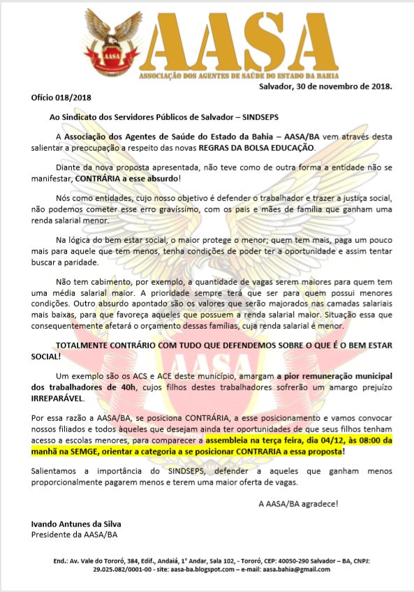 Diversos filiados procuraram a AASA/BA preocupados com a situação, devido a incerteza da possibilidade de manutenção dos seus filhos nas escolas em 2019.