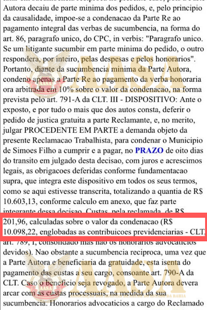 A AASA/BA, com o seu excelente corpo jurídico conseguiu na justiça o pagamento de parcelas devidas pelo município a nossa filiada. O valor da condenação ficou fixado em R$ 10.098,22 (dez mil e noventa e oito reais e vinte e dois centavos) , conforme sentença que pode ser vista abaixo: